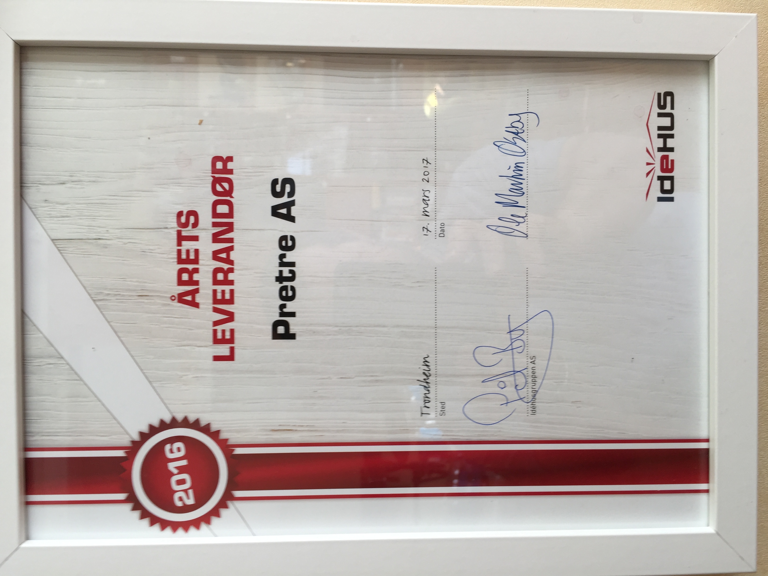 Pretre fikk utmerkelsen Årets Leverandør 2016 på Idèhus sin samling i mars. En stor anerkjennelse av den jobben alle i Pretre gjør hver dag. Vi takker Idèhus for prisen og det gode samarbeidet!